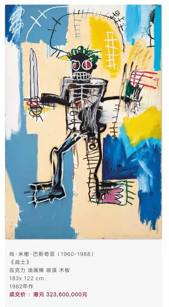 在剛剛結束的(2021年3月23日)佳士得香港拍賣會上,巴斯奇亞的曠世巨作《戰士》以3.236億港幣成交!成為亞洲拍賣史上成交價最高的西方藝術品!