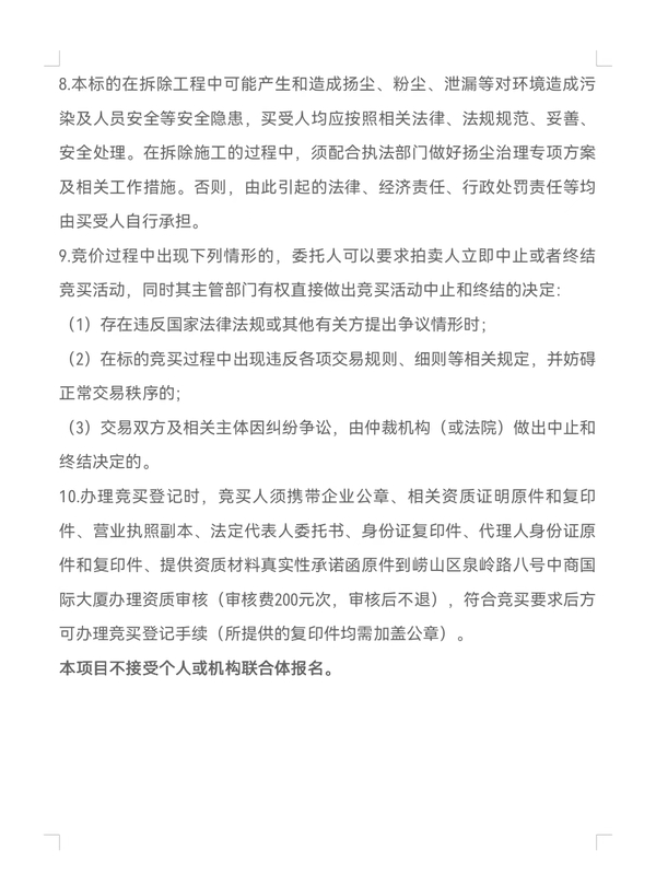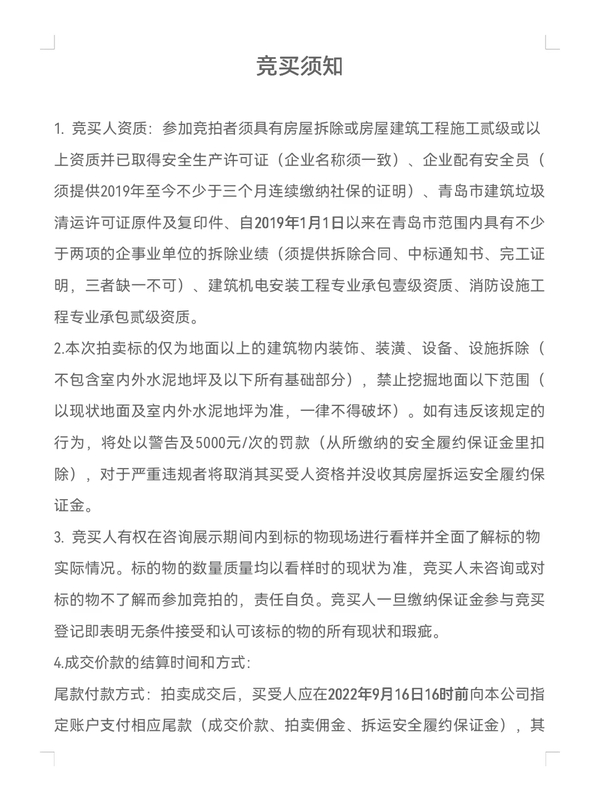 競買人應在2022年9月14日下午3點前(到賬時間為準)將拍賣保證金繳至指定帳戶(收款單位:青島市拍賣中心有限公司;開戶行:青島銀行海爾路支行;賬號:802230200293039),并于9月14日上午10點至下午3點前憑保證金收據以及相關資料的原件和復印件(資料內容詳見公司微信公眾號)到我公司辦理競買資格預審,經預審合格后方可取得競買資格,逾期不予辦理。