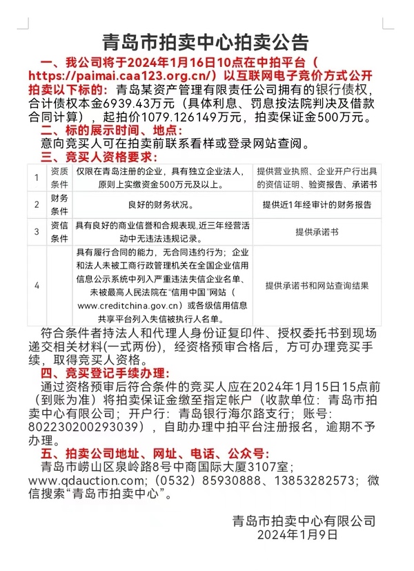 青島某資產管理有限責任公司擁有的銀行債權拍賣公告