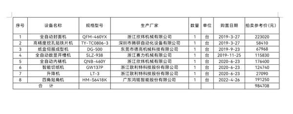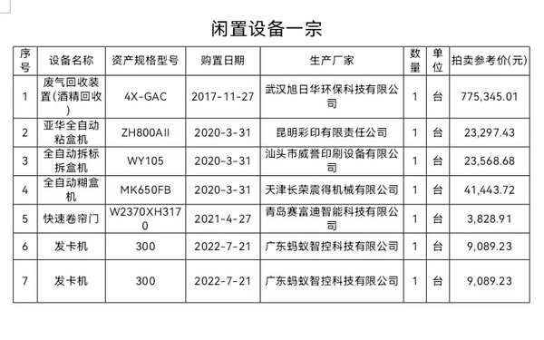 切紙機等印刷設備、貼角機、廢氣回收裝置(酒精回收)等閑置設備拍賣公告等閑置設備拍賣公告
