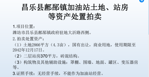 我公司近期將對山東地區(qū)加油站(租賃權、整體轉讓)進行公開拍賣,現(xiàn)進行拍賣前公開招商。