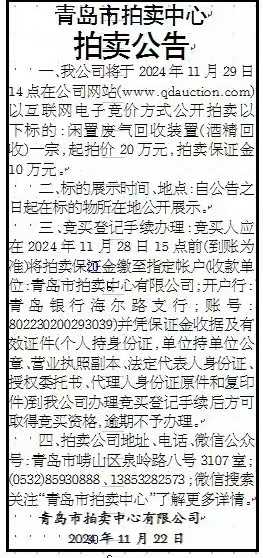 當前位置:首頁 > 拍賣公告 > 閑置廢氣回收裝置(酒精回收)