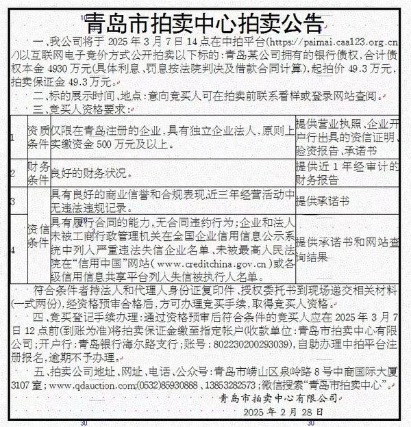 青島市拍賣中心 嶗山區泉嶺路8號中商國際大廈3107室