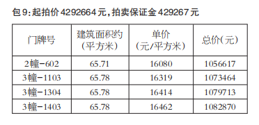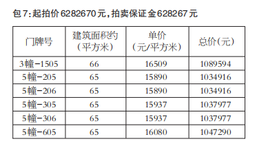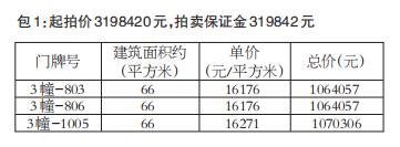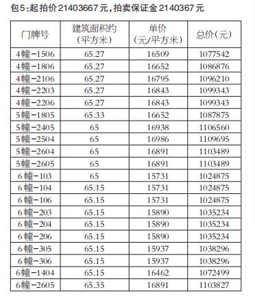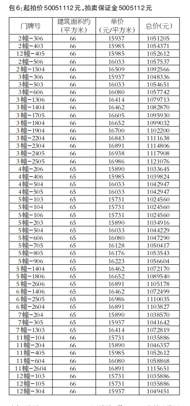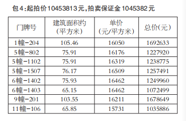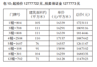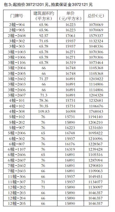 特別說明:1、該宗房產共分為10個包,按包出售;2、公告中所列舉的房屋面積僅供參考;3、拍賣保證金為起拍價的10%;4、拍賣成交后,買受人需自行補繳房屋公共維修基金;5、房產交易稅費按相關法規各自承擔;6、房屋按現狀進行拍賣,因質保期已過,房屋質量問題由買受人自行承擔。